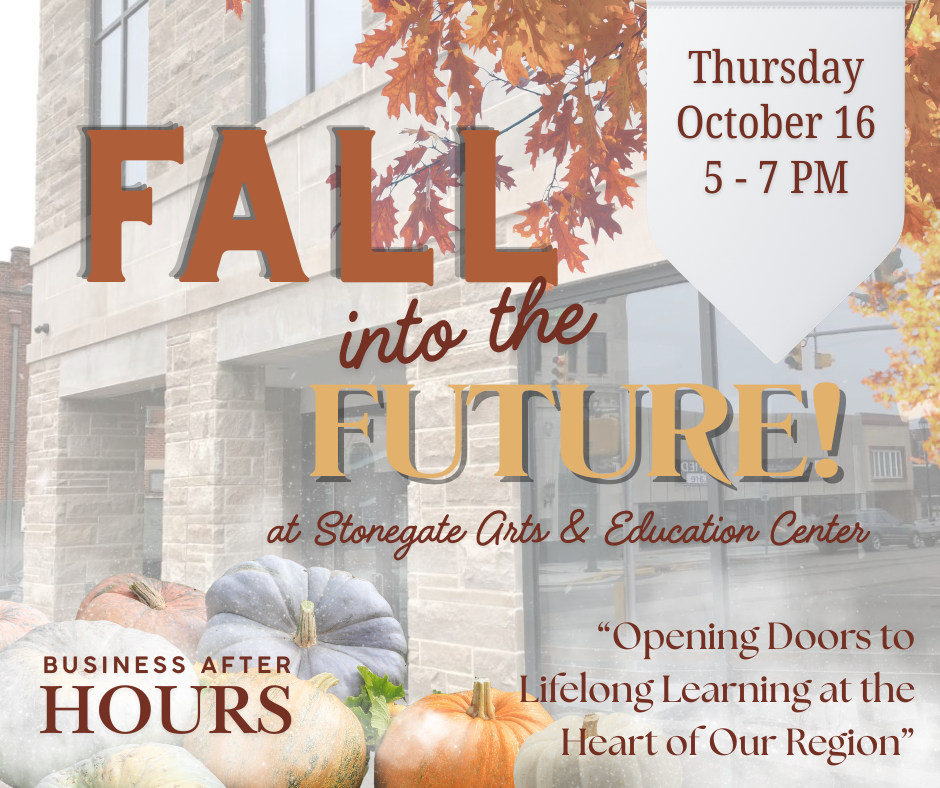 Be sure to join us on this Autumn evening to tour the Stonegate Center fand learn more about their commitment to lifelong learning and creating a solid foundation in the arts for all ages in our region. Enjoy delicious food, networking, and door prizes.